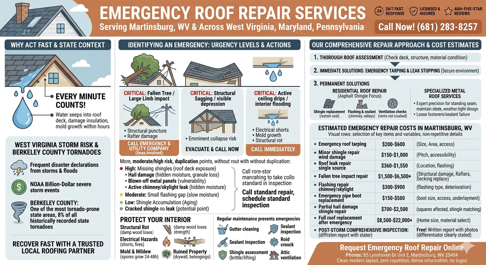 Understanding the general cost range of emergency roof repair helps homeowners make faster, more confident decisions when every minute counts. The figures below reflect typical costs across Martinsburg, Berkeley County, and neighboring communities in West Virginia, Maryland, and Pennsylvania, and according to Angi, the national average for a standard roof repair ranges between $400 and $1,960, with emergency response fees adding to that total depending on timing and scope.