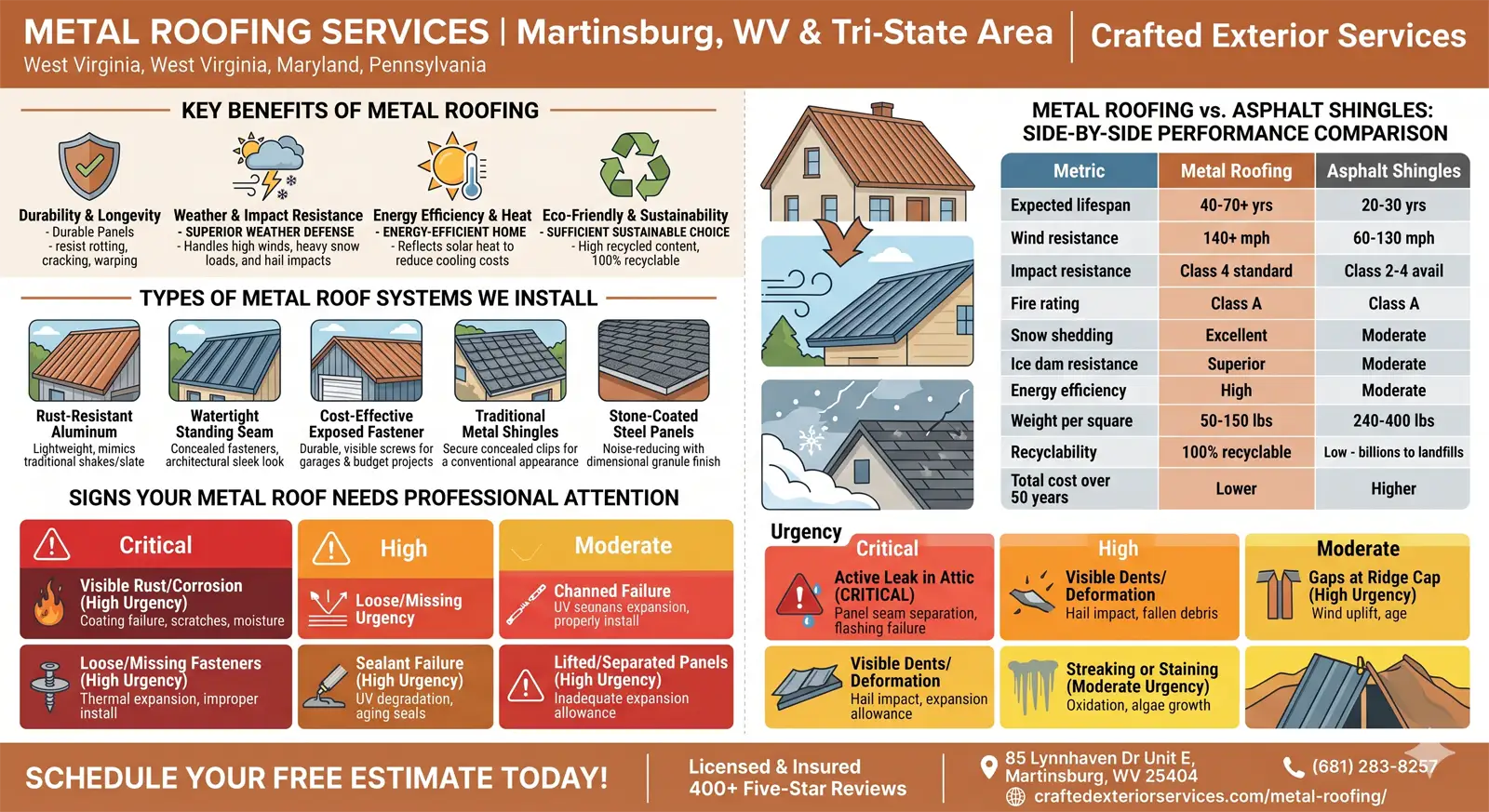 One of the most common questions homeowners across Martinsburg and the Eastern Panhandle ask before a roofing project is whether metal is genuinely worth the additional upfront investment over asphalt shingles. The table below provides a direct, honest comparison of both systems across every performance category that matters for West Virginia, Maryland, and Pennsylvania homeowners.