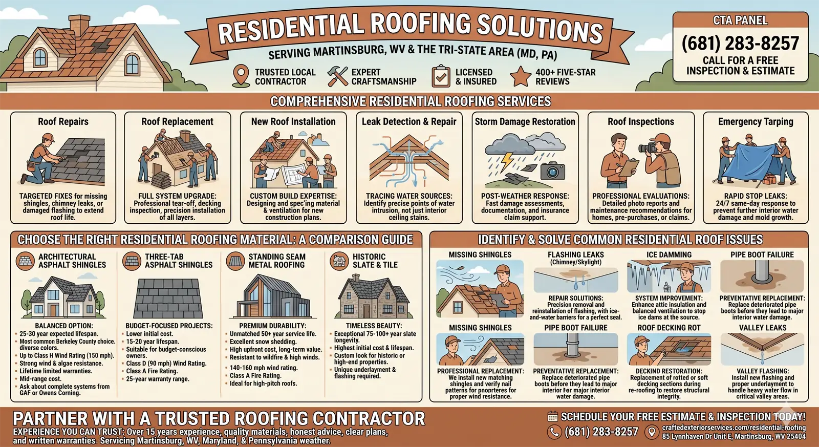 Your roof protects everything under it, which is why choosing the right residential roofing contractor is one of the most important decisions you can make as a Martinsburg homeowner. Crafted Exterior Services delivers residential roofing work built for West Virginia weather, with clear pricing, written warranties, and the kind of honest advice you would want from a contractor working on a neighbor’s house.
